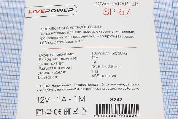 | - | БП  | 12В  | 1,0А  | 100~240В~  | адап  | штD5,5d2,5  | SP-67  | \-C+\стабил\импул\\\длина каб.1м |